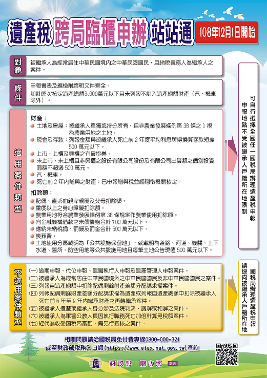 遺產稅跨局臨櫃申辦服務自108年12月1日開始
